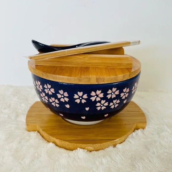 Sakura Cherry Noodle Bowl with Chopstick, Spoon, Lid and Trivet Set Enhance your dining experience with this elegant blue floral bowl set. Featuring a beautiful floral design, this set includes a matching spoon and chopsticks, lid and trivet. Perfect for adding a touch of sophistication to your meals. CERAMIC AND BAMBOO BRAND NEW IN BOX